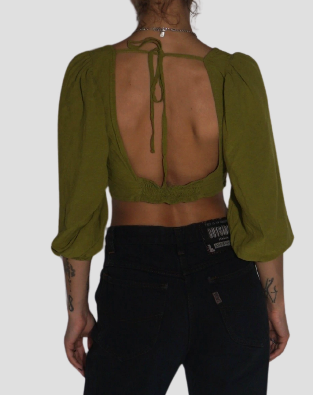 Cropped com detalhe de abertura e amarração nas costas, manga meio bufante, tecido viscose Marca: Manacá Condição: Ótimo estado. Tamanho P Medidas: Comprimento 37cm, Busto 79-84cm